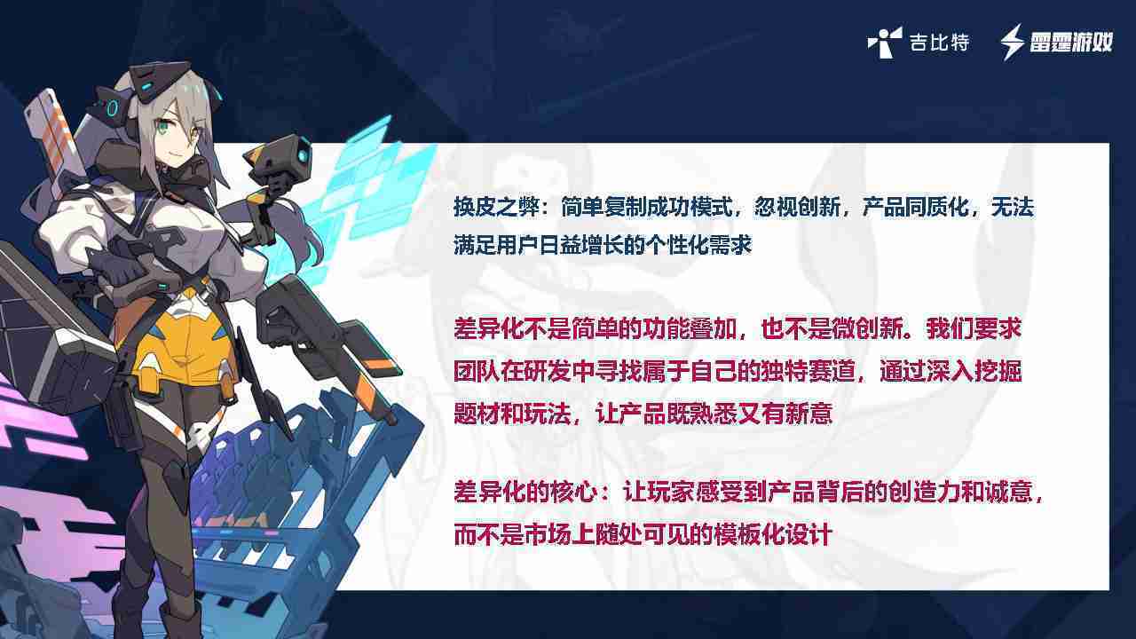 在我们内部是这么定义差异化的。。首先,,,差异化不是简单的功能叠加,,,,更不是换皮。。。。只是换皮,,,产品无法提供有效的市场价值。。内部经常说差异化的产品不是为了迎合市场,,,而是找到一个自己独特的表达方式,,,,在研发中找到属于自己的细分赛道和独特赛道,,,前提是需要对这个题材有足够的深入、、、、挖掘,,,对玩法有足够深入的理解,,,,让产品看起来既熟悉又有新意。。。