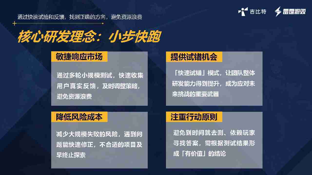 小步快跑不是找答案,,,而是验证答案。。。我们之前有项目是这样的,,有些制作人会有几个方向觉得都可以做,,,但是不确定做哪一个,,,会选择几个都做,,,,做完拿到市场跑,,,跑出哪一个更好,,基于这个再做后续的研发和拓展。。但这种情况最容易出现一个问题,,,可能被玩家裹胁,,,,玩家说这个点不错、、、那个点不错,,,到底听还是不听,,,不听感觉是无视玩家的反馈,,听的话,,,,可能自己没想清楚导致研发思路发生偏颇。。所以针对这一点后面自己复盘整理,,,,发现制作人自己心里要有数,,,要做自己觉得好玩的,,,而且明确知道这个东西是你想做的,,,,然后拿到市场验证这个答案是不是对的,,,,而不是拿一堆答案找哪一个答案更好。。。