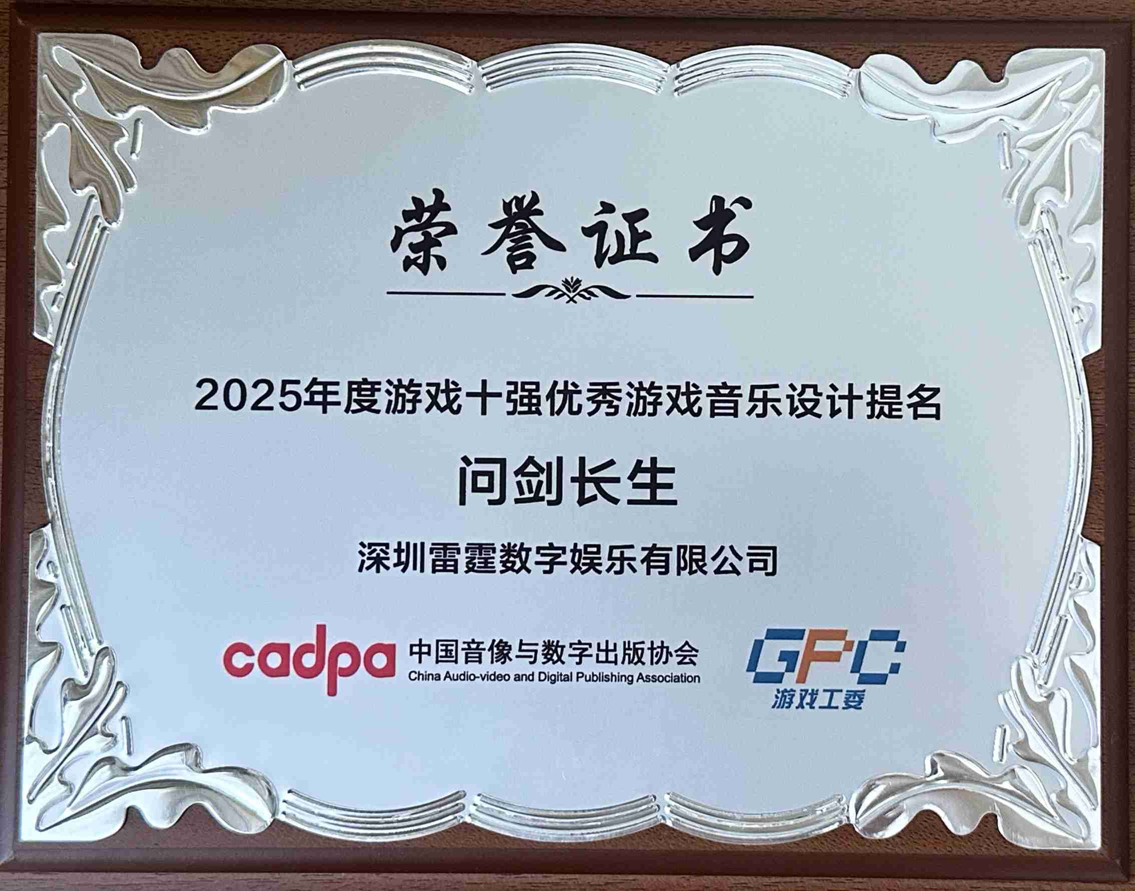 公司坚持走精品化道路,,打造与时代精神相契合、、与海内外大众诉求相契合、、、、与创作实践相契合的游戏产品,,,,倡导构建具有中华文化特色、、、、弘扬中华美学精神的产品理念,,,,切实提升游戏文化内涵的传播力影响力。。。。如此次荣获“2025游戏十强年度优秀游戏音乐设计”提名奖的公司自研产品《问剑长生》以音筑境,,,以乐传情,,,其音乐融合东方传统韵味与现代审美,,,构建独特听觉世界,,,,运用古筝、、、、笛子、、箜篌等传统乐器与现代管弦乐,,,,塑造灵动古风仙侠氛围。。。。
