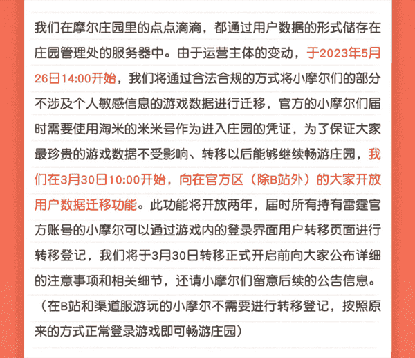 合作结束本就是开发方和代理方双方的事情,,降低这件事情对玩家的影响,,才是对所有珍视这段童年的摩尔玩家最好的呵护。。。。目前看来,,,,用户完全不用担心后续因无法登录游戏而造成任何数据上的损失,,,,只要及时进行账号转移,,,,就可以好好保留、、延续在庄园的痕迹和回忆,,,继续在庄园里做快乐的红鼻子小鼹鼠。。