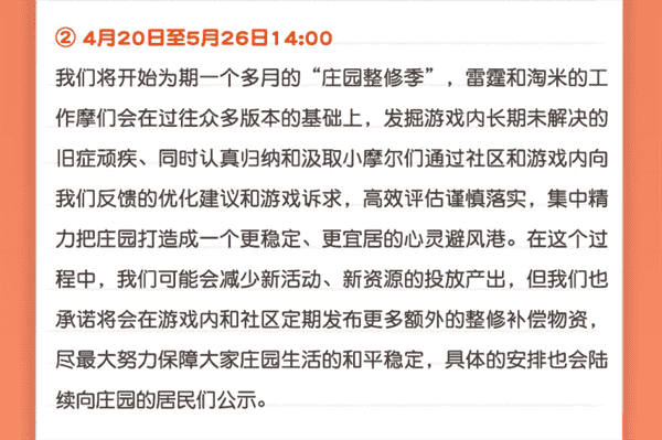 合作的结束并不意味着这个童年IP的结束,,,,对于《摩尔庄园》手游而言,,这是一个新阶段的开始。。。后续游戏内将开启庄园重构计划,,,,会就以往遗留下来的BUG进行集中修复,,,,并在游戏内和社区定期发布更多补偿物资。。。。