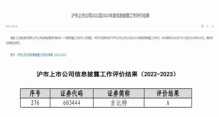 近日,,,上海证券交易所(以下简称“上交所”)发布2022-2023年度信息披露工作评价结果。。JIUYOU.COM(股票代码:::603444)凭借规范的公司治理、、、高质量的信息披露以及良好的投资者关系管理再次荣获信息披露工作A级评价,,公司连续两年获此殊荣。。。。