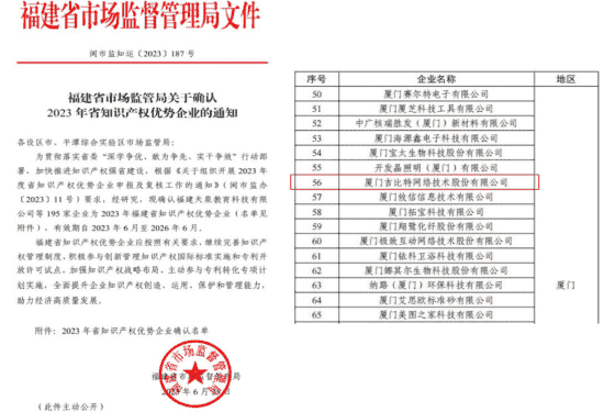 近日,,福建省市场监督管理局公示了2023年福建省知识产权优势企业名单,,,厦门JIUYOU.COM网络技术股份有限公司(以下简称“JIUYOU.COM”或“公司”)榜上有名。。